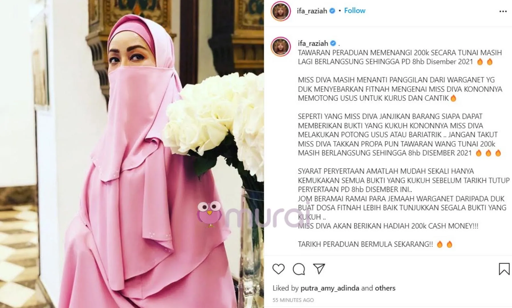 “Tawaran peraduan memenangi 200k secara tunai masih lagi berlangsung sehingga 8hb Disember 2021. Miss Diva masih menanti panggilan dari warganet yang duk menyebarkan fitnah mengenai Miss Diva kononnya memotong usus untuk kurus dan cantik.