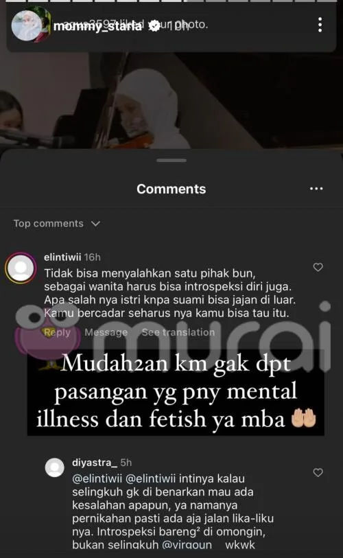 “Tak boleh salahkan satu pihak, sebagai perempuan kena muhasabah diri juga. Apa salahnya istrei kenapa suami bisa jajan(makan) di luar. Kamu bercadar seharusnya kamu tau itu,” tulis komen @elintxxxx, dipetik dari Suara.com.