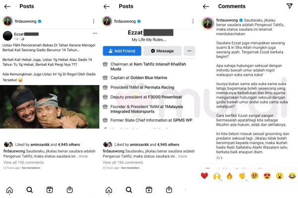Murai MY menjengah ke Instagram Firdaus Wong di mana pendakwah terkenal ini, memuatnaik tangkap layar muatnaik milik seorang lelaki dikenali sebagai Ezzat di media sosialnya.