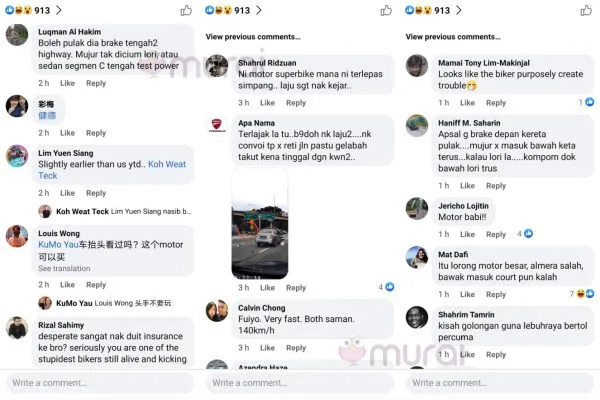 Kejadian yang berlaku mendapat pelbagai komen dan reaksi warga Facebook, rata-rata ramai sependapat penunggang motosikal tersebut yang bersalah.