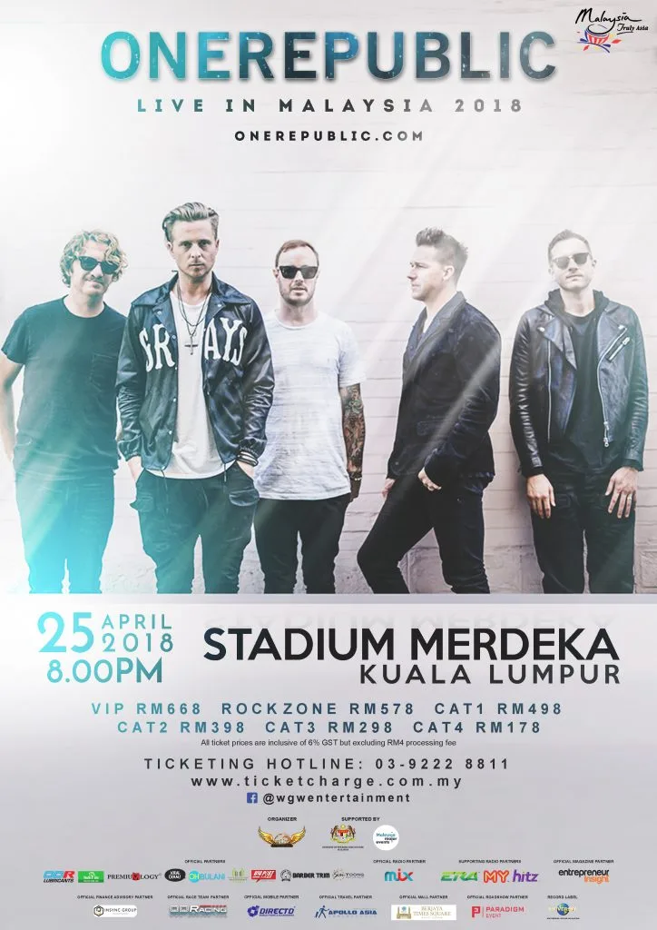 Kami di murai.my berharap sangat konsert Onerepublic kali ini berjalan lancar tanpa sebarang bantahan dari mana-mana pihak. Mana tidaknya, macam-macam hal yang berlaku jika ada artis antarabangsa mahu mengadakan konsert di Malaysia. Tahun lepas saja ada beberapa konsert terpaksa dibatalkan di saat-saat terkakhir.