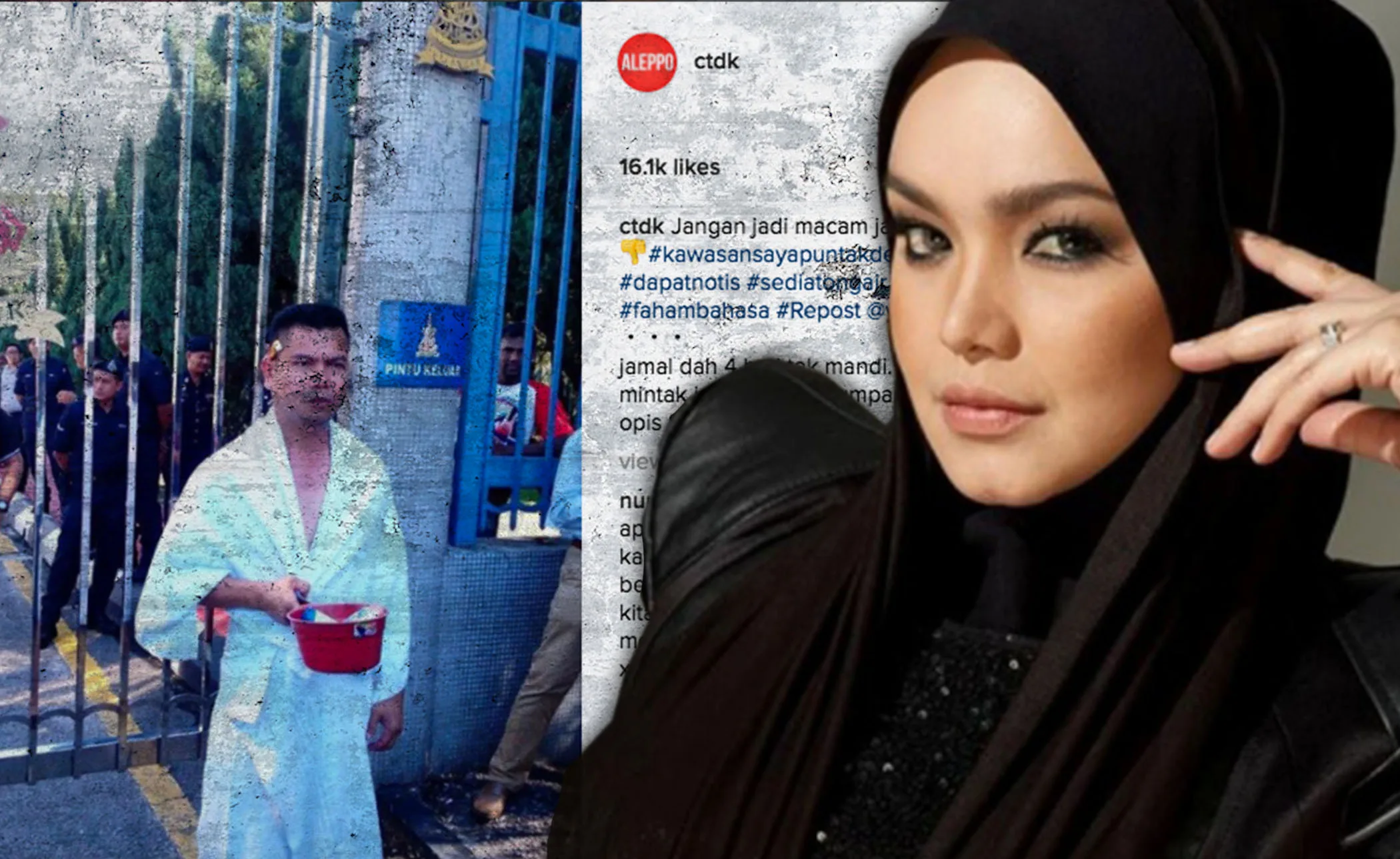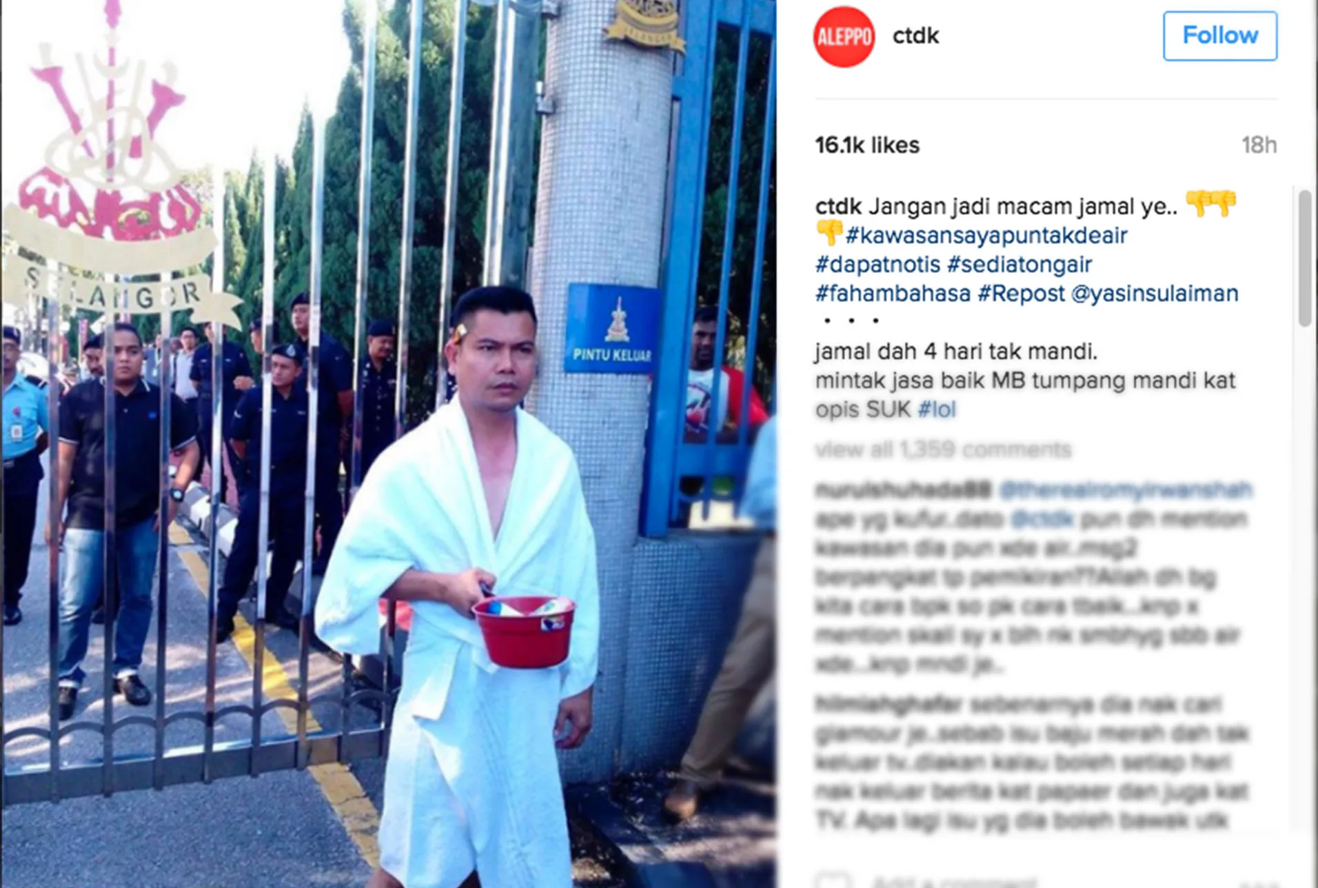 “Jamal dah 4 hari tak mandi. Mintak jasa baik MB tumpang mandi kat opis SUK #lol”, tulisan yang tertera di Instagram Siti Nurhaliza.