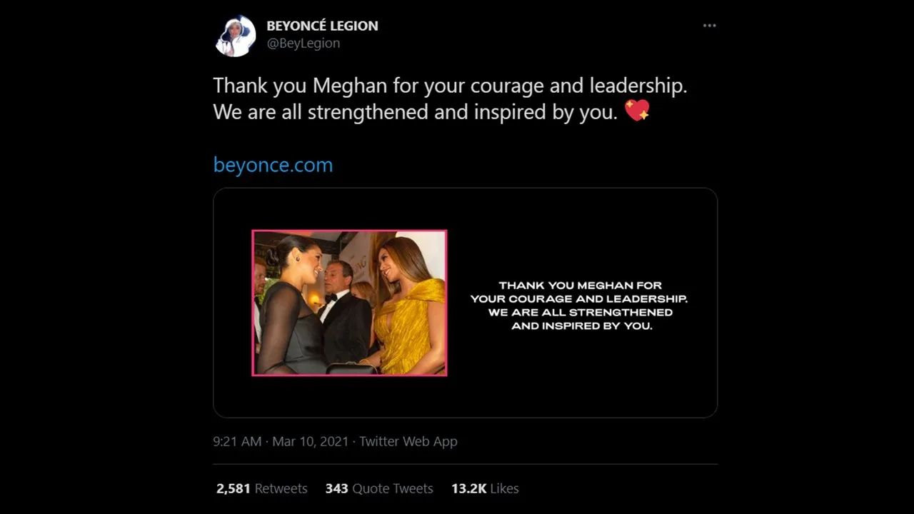 Mesej itu disertakan dengan gambar pertemuan Beyoncé dan Meghan di tayangan perdana The Lion King pada tahun 2019.