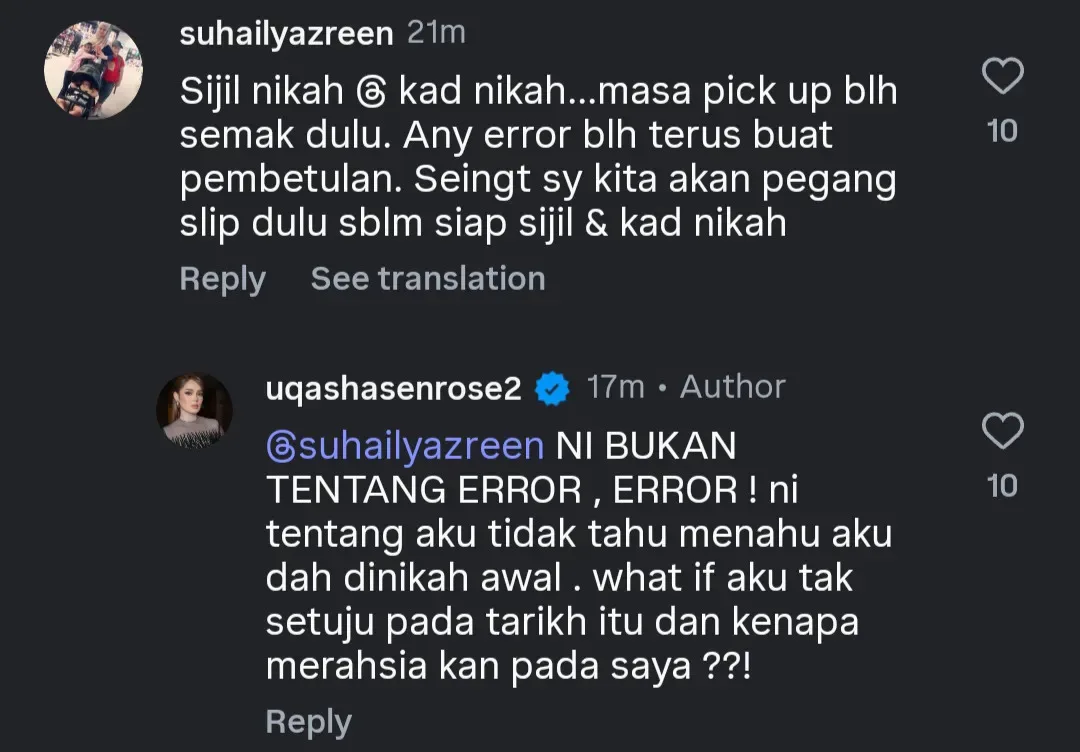 Hantaran Uqasha mencetuskan pelbagai reaksi netizen di ruangan komen, malah ada yang menyifatkan berlaku kesilapan teknikal pada sijil nikah tersebut.
