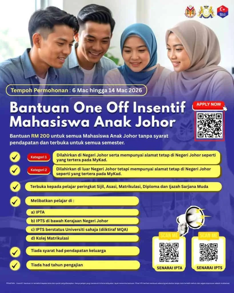 Berita baik buat mahasiswa anak Johor, Kerajaan Negeri Johor melalui Yayasan Pelajaran Johor (YPJ) kini membuka permohonan Insentif Mahasiswa Anak Johor (IMAJ) 2026, iaitu bantuan kewangan RM200 secara one- off kepada pelajar yang layak.