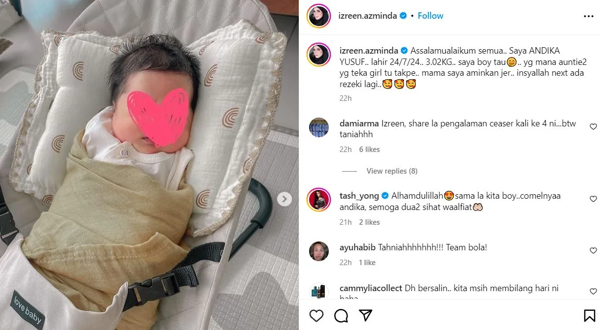 Pelakon Izreen Azminda baru-baru ini ada memuat naik satu hantaran di Instagram miliknya mengenai kelahiran bayinya yang keempat.
