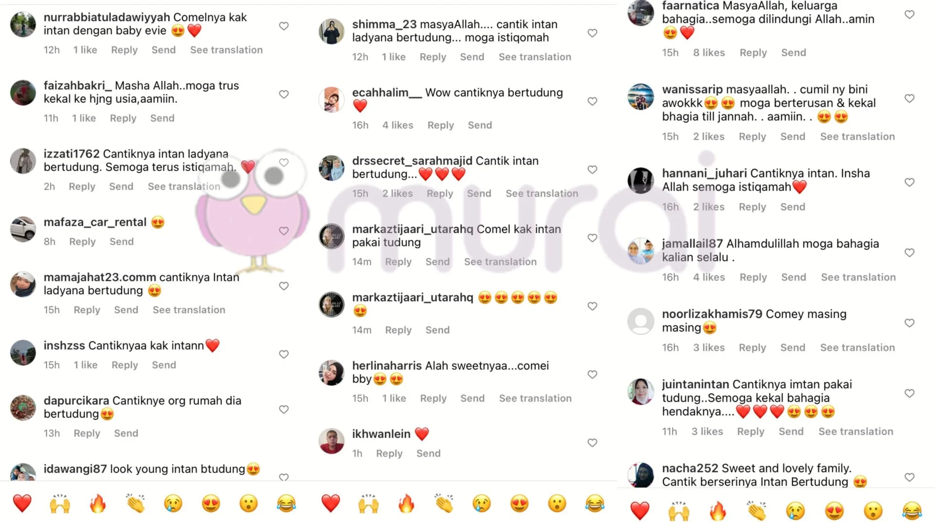 Tinjauan Murai My di ruangan komen mendapati rata-rata peminat meluahkan rasa teruja dengan penampilan baharu Intan Ladyana, malah ramai yang turut menitipkan doa agar beliau akan terus istiqomah.