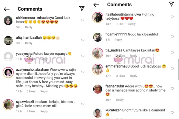 Melihat perkembangan terkini pelakon jelita ini sebagai pelajar undang-undang di media sosial, membuatkan ramai peminatnya meluahkan rasa kagum dan mendoakan yang terbaik untuk Intan.