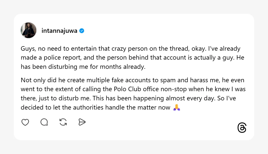 Perkara ini sudah berlaku hampir setiap hari. Jadi saya membuat keputusan untuk membiarkan pihak berkuasa menguruskan hal ini sekarang.”-tulis Intan Najuwa di Threads