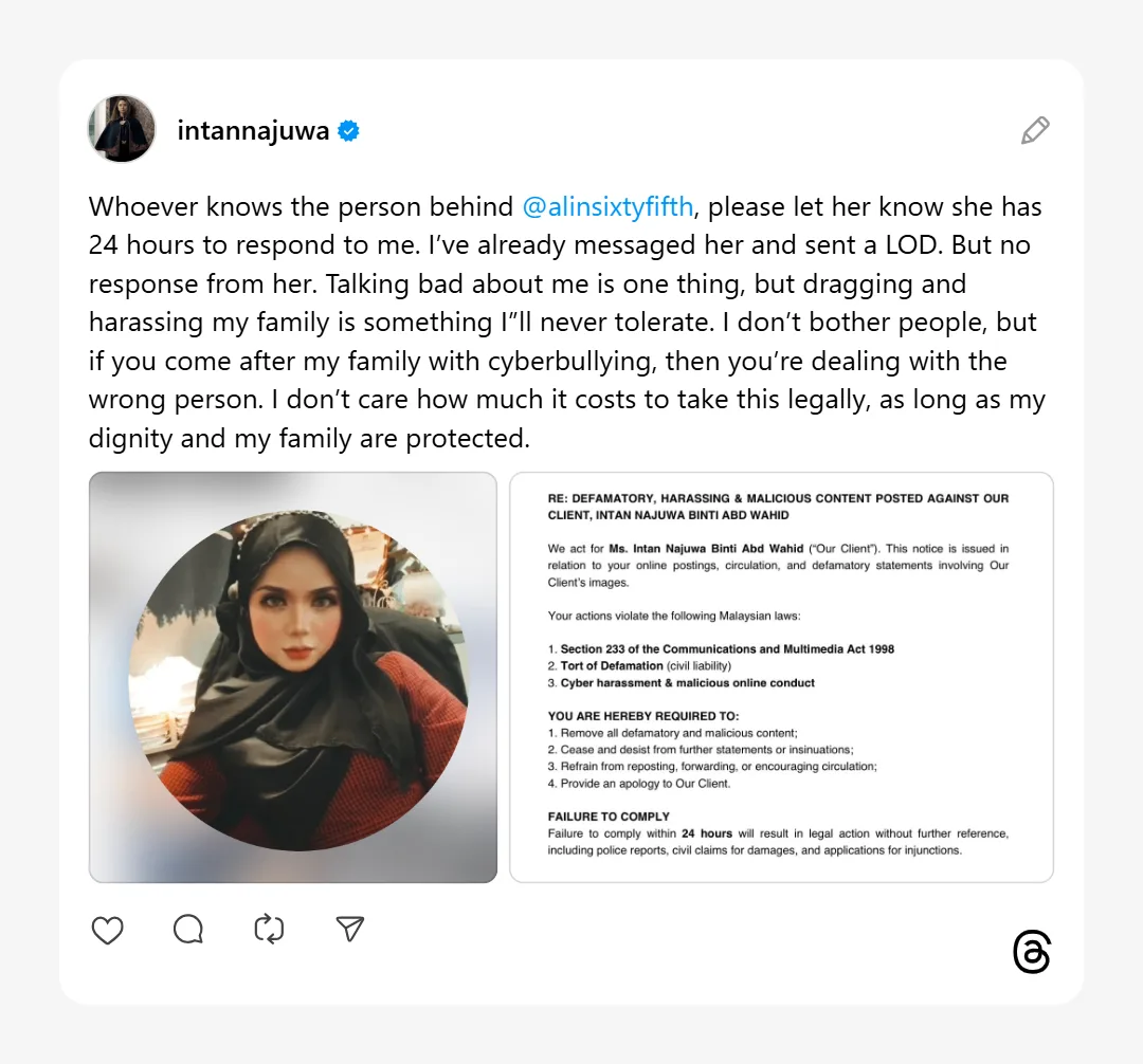 Intan atau Intan Najuwa Abdul Wahid menerusi hantaran di Thread, turut memohon orang ramai yang mengenali netizen terlibat untuk memberi makluman bahawa dia mempunyai tempoh 24 jam untuk memberikan respon terhadap mesej dan surat tuntutan yang dihantarnya selepas melemparkan kata-kata yang buruk mengenainya dan juga keluarga.