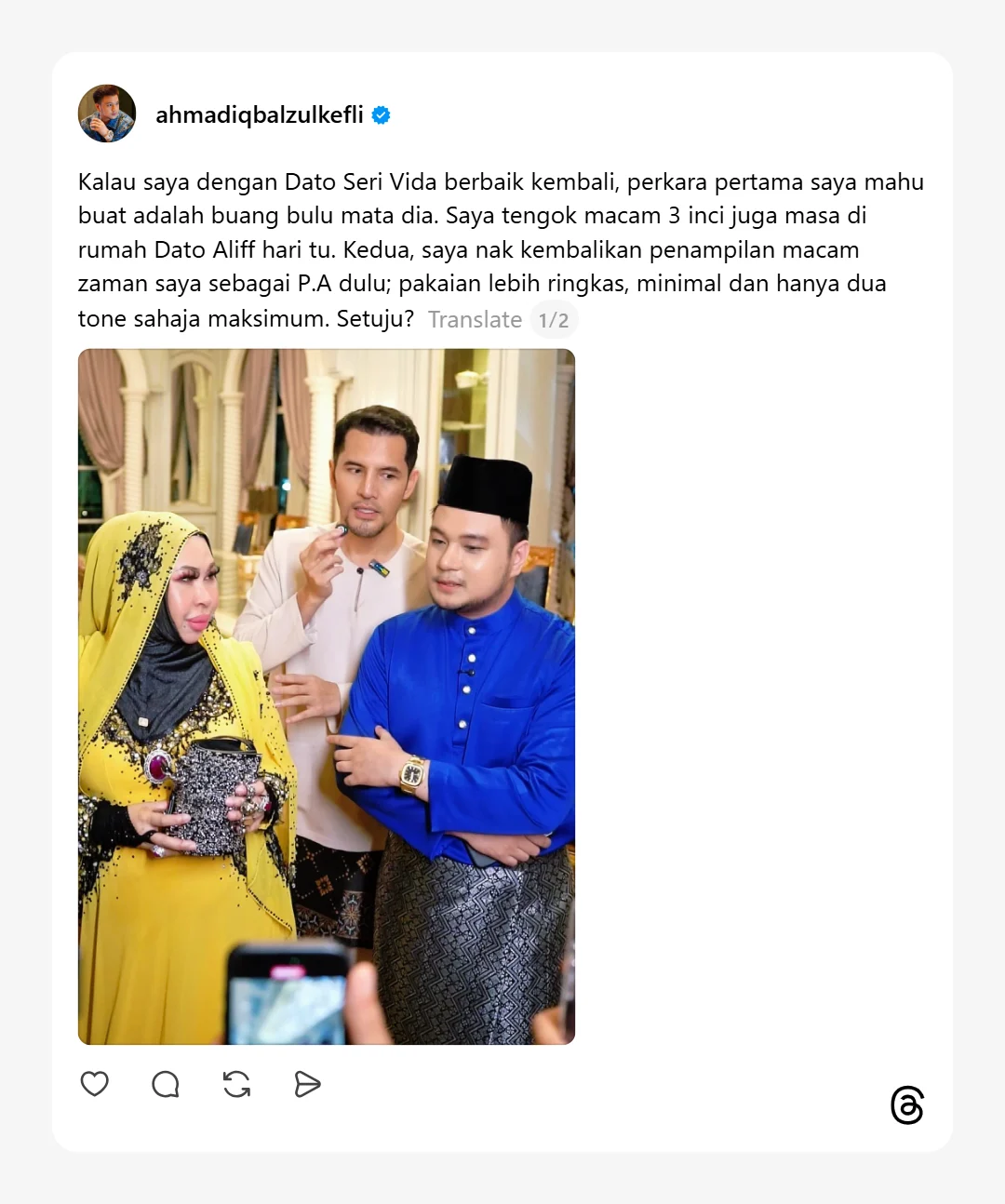 “Kalau saya dengan Dato Seri Vida berbaik kembali, perkara pertama saya mahu buat adalah buang bulu mata dia. Saya tengok macam 3 inci juga masa di rumah Dato Aliff hari tu.