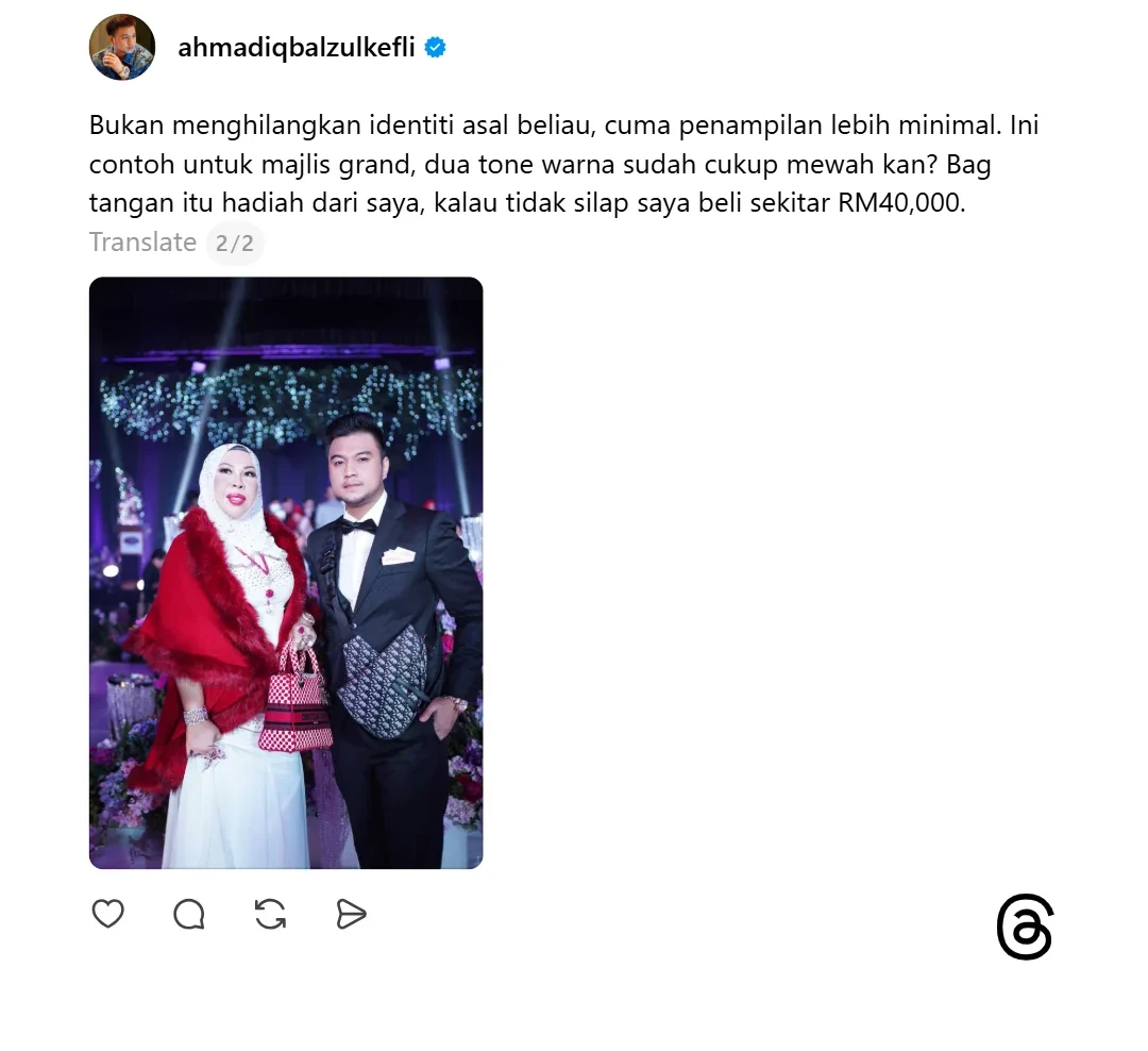 “Bukan menghilangkan identiti asal beliau, cuma penampilan lebih minimal. Ini contoh untuk majlis grand, dua tone warna sudah cukup mewah kan? Beg tangan tu hadiah dari saya, kalau tak silap saya beli sekitar RM40,000.”-tambah Iqbal