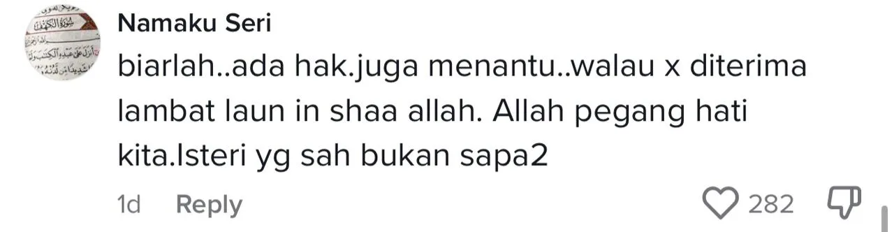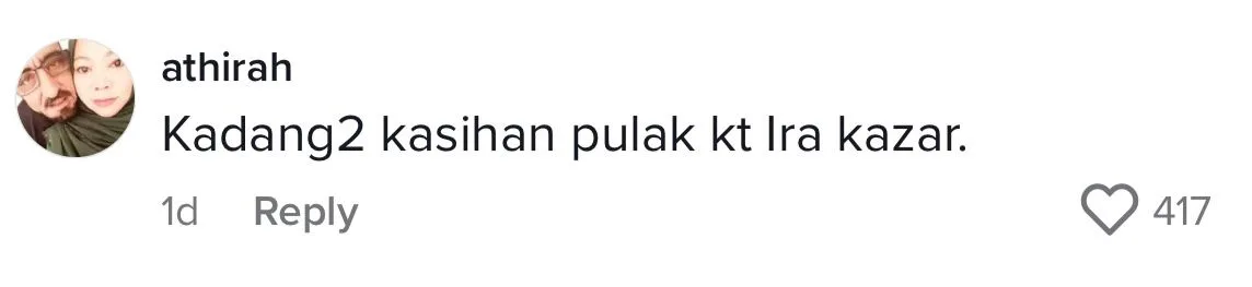 Bagaimanapun, menjengah ke ruangan komen, rata-rata warganet ada yang meluahkan merasa simpati dengan nasib Ira kerana dianggap tidak diterima oleh keluarga mentuannya itu.