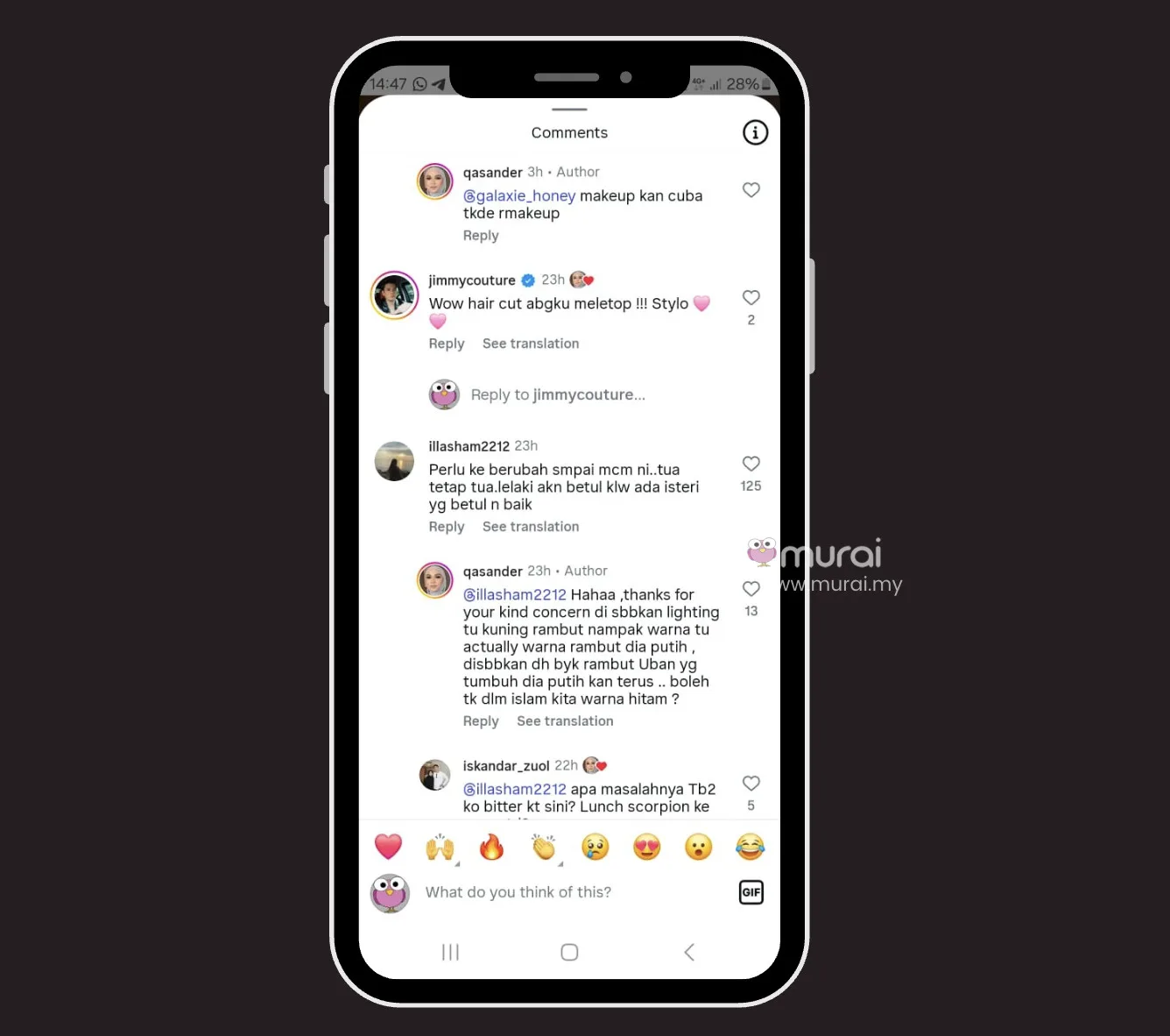 “Haha, terima kasih untuk rasa ambil peduli. Disebabkan pencahayaan itu kuning, rambut nampak warna. Sebenarnya rambut dia putih. Disebabkan dah banyak rambut uban yang tumbuh, dia putihkan terus. Boleh tak dalam Islam kita warna hitam?” – balas Qasander.