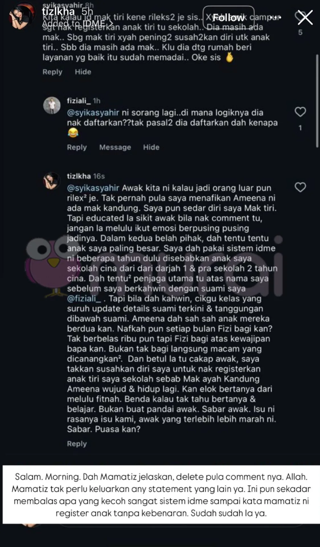 Dalam pada itu, isteri kepada Fizi Ali iaitu Zulaikha tampil memberi respon terhadap komen salah seorang netizen yang mengkritiknya campur tangan isu pendaftaran sekolah anak tirinya itu.