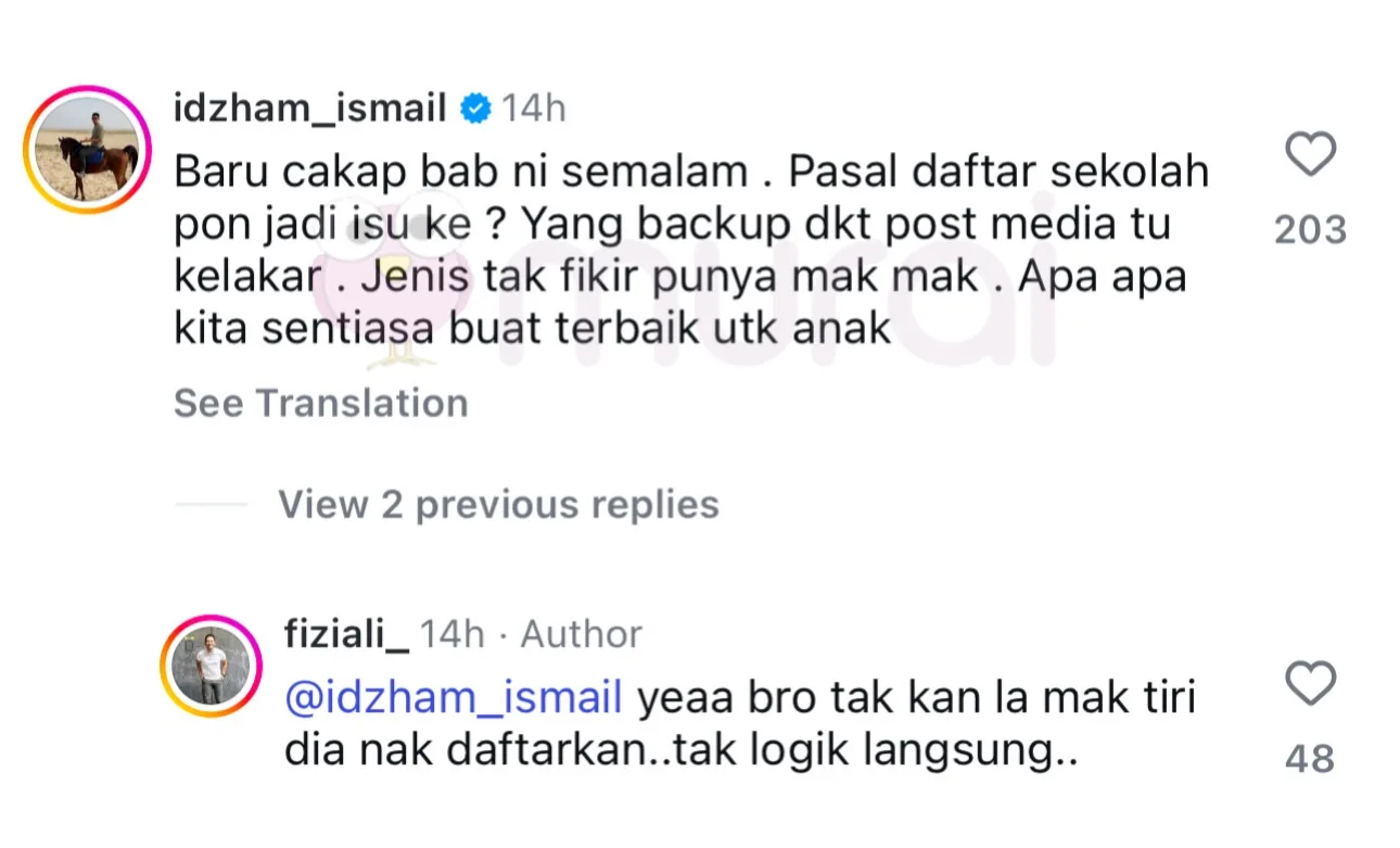 Yang backup dekat post media tu kelakar. Jenis tak fikir punya mak-mak. Apa-apa kita sentiasa buat terbaik untuk anak.”-komen Idzham Ismail