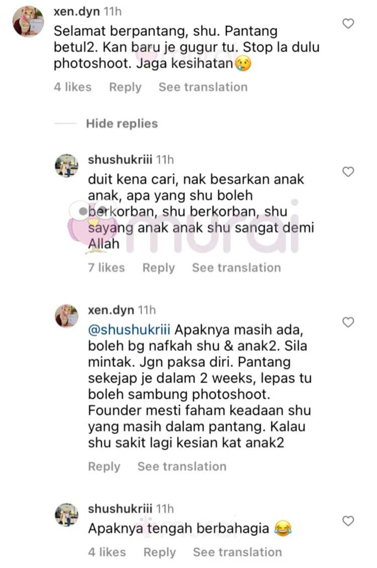 Dalam pada itu, Shu turut membalas komen netizen yang meminta untuk menjalani tempoh berpantang dengan baik setelah mengalami keguguran. Jelas Shu, dia harus keluar untuk mencari duit demi membesarkan kedua-dua anaknya itu.