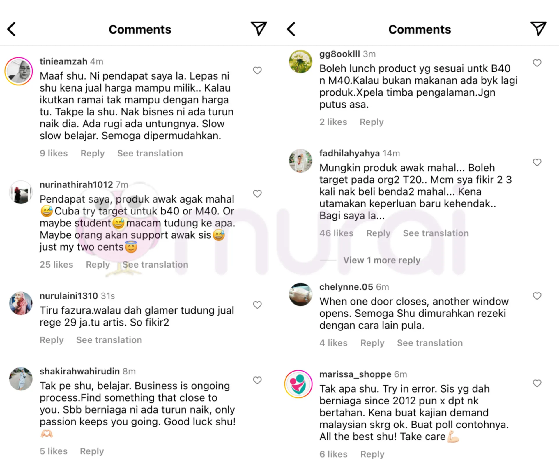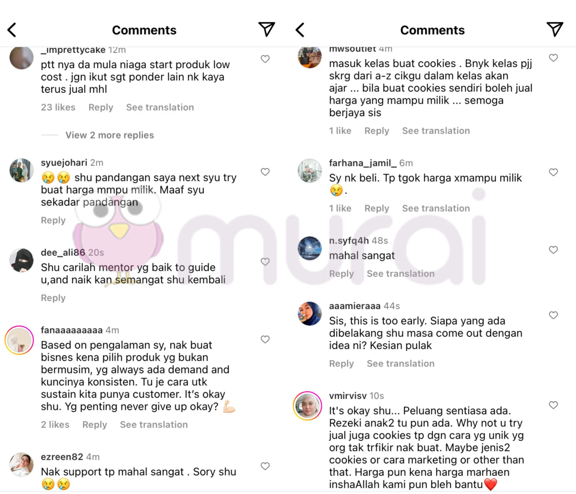 “Pendapat saya, produk awak agak mahal. Cuba try target untuk B40 atau M40 atau student. Maybe orang akan support awak sis.”