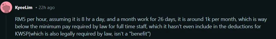 Satu perkongsian di Reddit baru-baru ini mencetuskan perbincangan hangat dalam kalangan warganet apabila seorang individu mempersoalkan tawaran gaji RM5 sejam yang dikatakan datang bersama “benefit” seperti KWSP dan PERKESO.