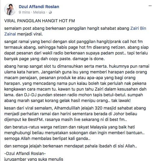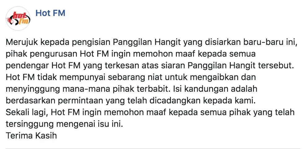 Susulan dari perkembanga artikel murai.my sebentar tadi mengenai segmen panggilan hangit yang dikendalikan oleh stesen radio terkenal, Hot FM yang dikecam hebat netizen gara-gara memuat naik panggilan palsu ke atas seorang sukarelawan yang memohon bantuan tajaan, mereka tampil dengan kenyataan memohon maaf secara terbuka.