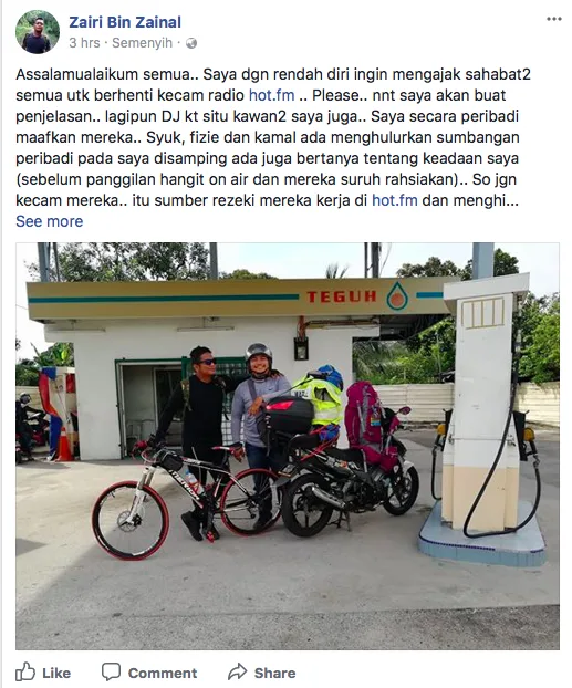 Dalam perkembangan lain, Zairi menerusi kenyataannya di Facebook juga telah memaafkan stesen radio itu serta tidak salahkan mereka 100%.