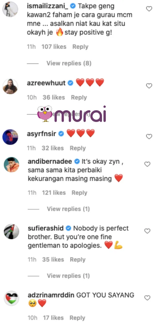 Di ruangan komen, rakan-rakan selebriti seperti Ismail Izzani,Andi Bernadee, Sufi Rashid dan ramai lagi memuji sikap Zyn yang tampil memohon maaf maaf dan turut berkata sebagai manusia biasa pasti tidak akan lari daripada melakukan kesilapan.