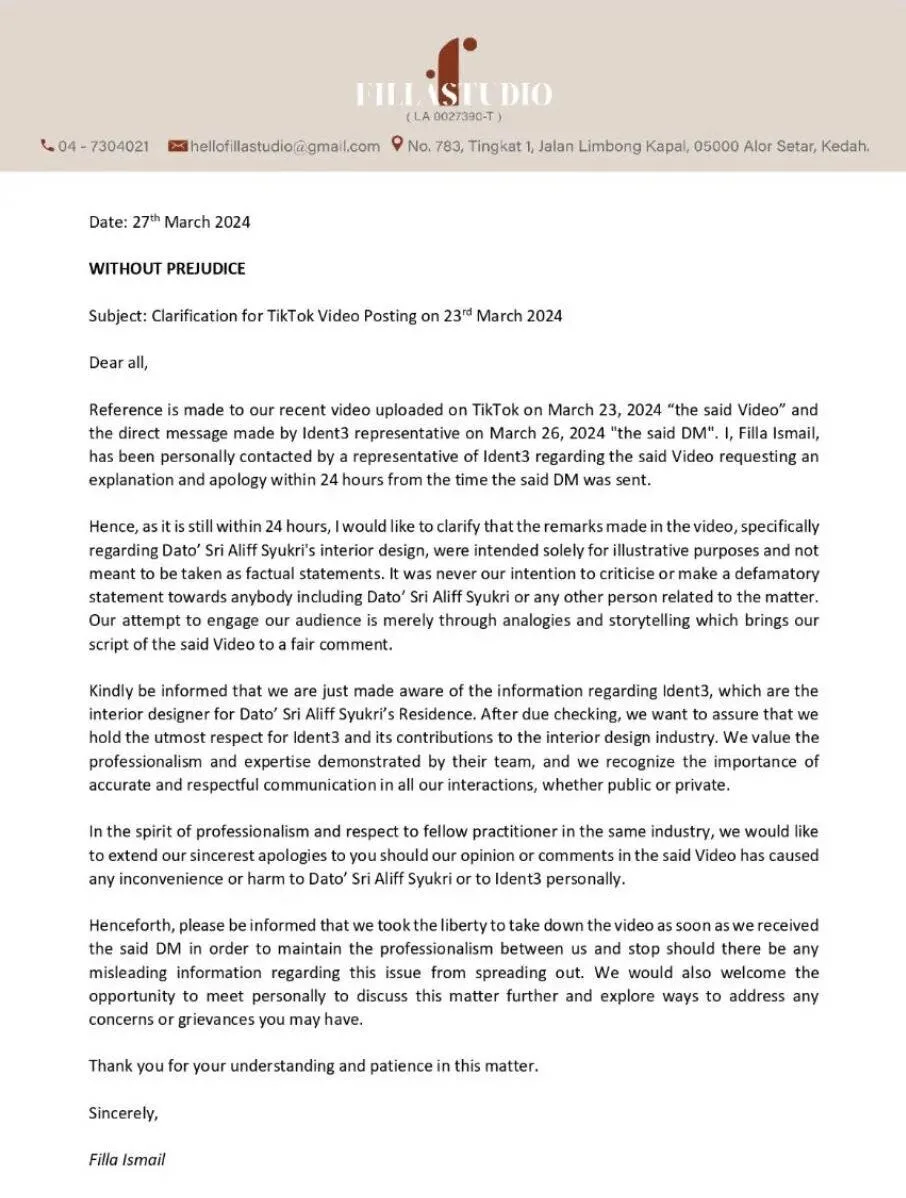 Pereka hiasan dalaman yang dikenali sebagai Filla Studio tampil memberikan kenyatan rasmi di TikTok selepas dihubungi pihak Aliff yang mahukan penjelasan serta membuat permohonan maaf dalam tempoh 24 jam berhubung video tular itu.