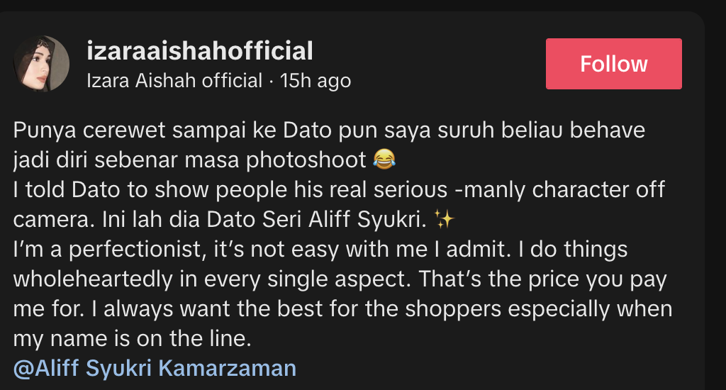 Kolaborasi ini bukan sahaja memperlihatkan sisi profesional Izara Aishah, malah membuktikan walaupun bergandingan dengan figura yang penuh karakter seperti Dato’ Seri Aliff Syukri, prinsip dan standard tetap tidak diketepikan. Bak kata orang, cerewet itu perlu, asalkan hasilnya memuaskan hati semua.