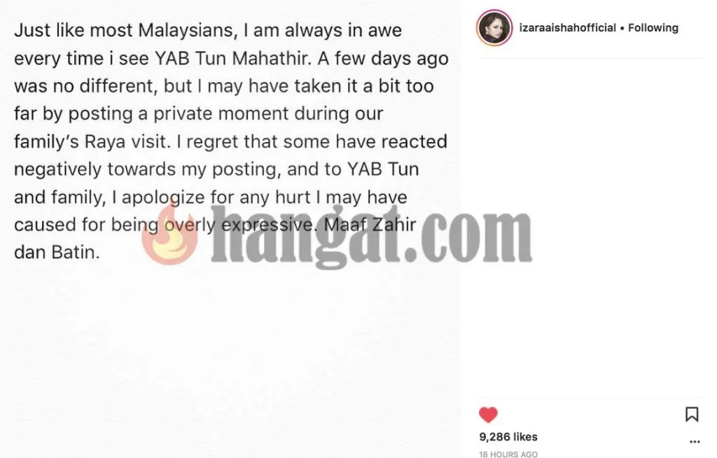 Izara menerusi satu posting di akaun Instagramnya semalam memberitahu gambar itu di ambil ketika dia berkunjung ke kediaman Tun Mahathir sempena menyambut hari raya. Izara berkata, dia juga seperti orang lain yang menghormati perdana menteri Malaysia yang ke-7 itu, namun tak menjangka gambar mesra dia bersama Tun Mahathir undang komen negatif dari orang ramai.