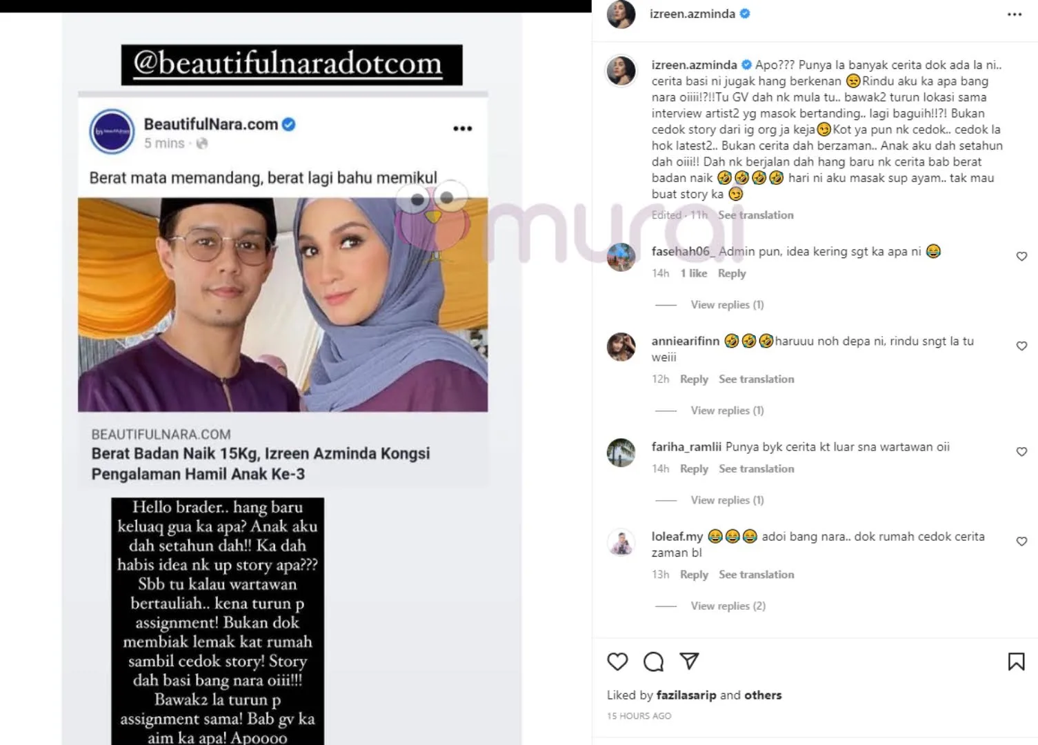 Pelakon, Izreen Azminda meluahkan rasa berang terhadap sebuah portal hiburan yang dikatakan ‘kering idea’ memuatnaik artikel mengenai dirinya yang mengalami pertambahan berat badan sewaktu hamil anak ketiga dahulu.