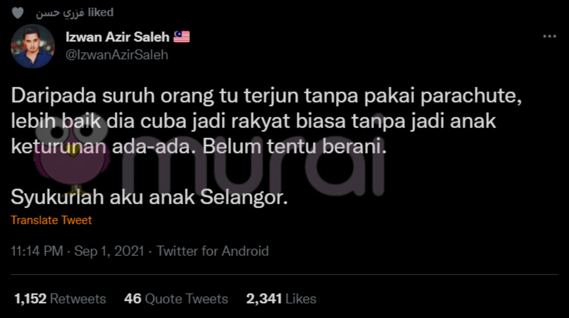 Menerusi laman Twitter, penyampai radio ini menyatakan bahawa adalah lebih baik figura yang dimaksudkannya itu cuba untuk menjadi rakyat biasa.