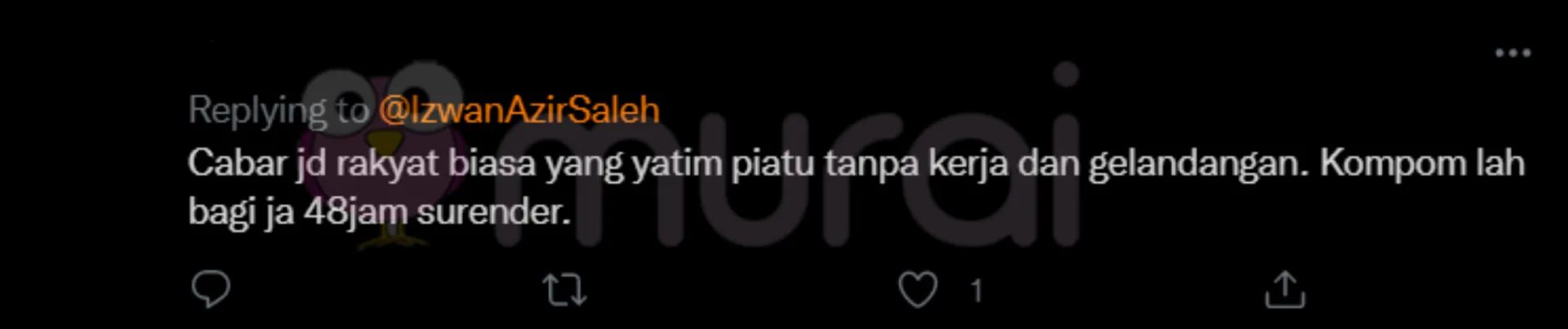 “Cabar jadi rakyat biasa yang yatim piatu tanpa kerja dan gelandangan. Kompom la bagi ja 48 jam surrender.” ujar mereka