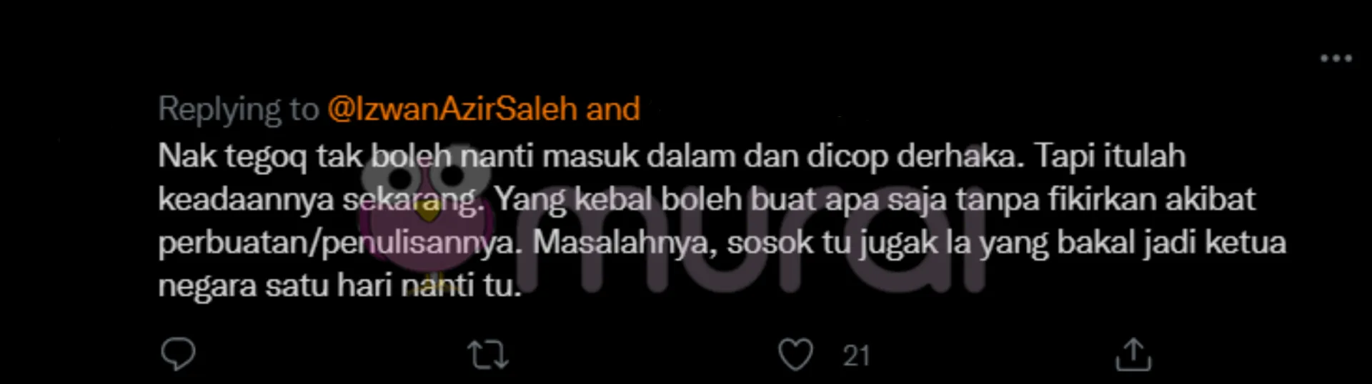 “Nak tegoq tak boleh nanti masuk dalam dan dicop derhaka. Tapi itulah keadaannya sekarang. Yang kebal boleh buat apa sahaja tanpa fikirkan akibat perbuatan/ penulisannya. Masalahnya. sosok itu jugak la yang bakal jadi ketua negara satu hari nanti tu.”