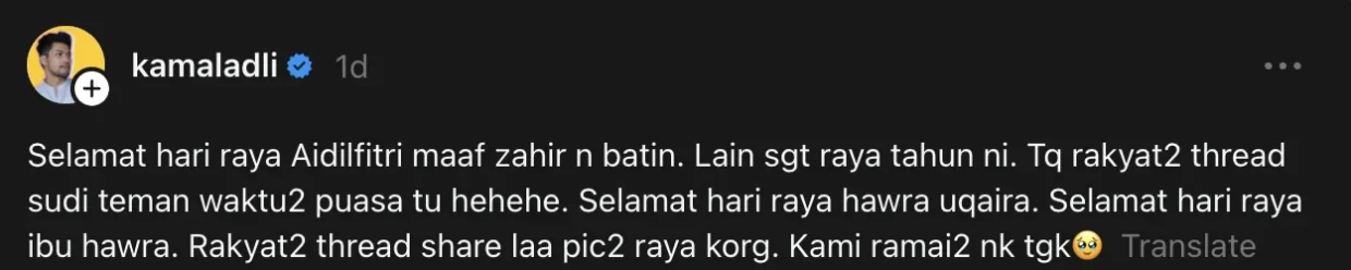“Selamat Hari Raya Aidilfitri, maaf zahir dan batin. Lain sangat raya tahun ni. Tq rakyat-rakyat thread sudi teman waktu-waktu puasa tu hehehe. Selamat Hari Raya Hawra Uqaira. Selamat Hari Raya ibu Hawra. Rakyat-rakyat thread share la pic-pic raya korang. Kami ramai-ramai nak tengok.”