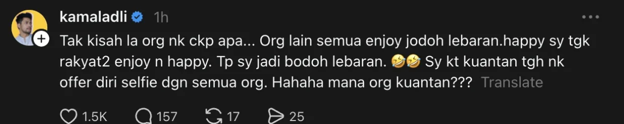 “Tak kisah la org nak cakap apa… Org lain semua enjoy jodoh lebaran. Happy sy tengok rakyat-rakyat enjoy n happy. Tp sy jadi bodoh lebaran, Sy kat Kuantan tengah nak offer diri selfie dgn semua org. Hahaha mana org Kuantan???”