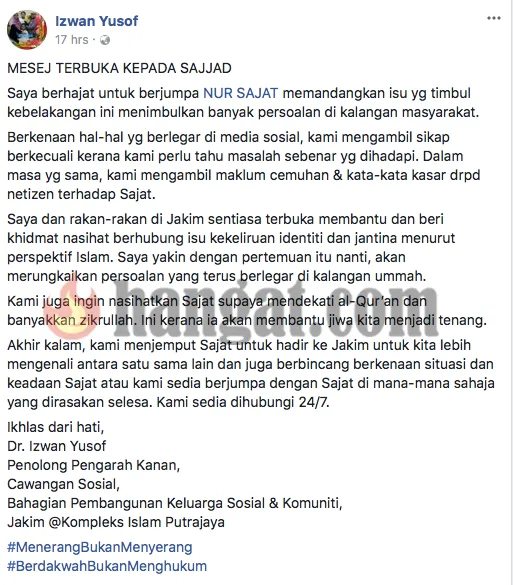 Terbaru, Penolong Pengarah Kanan, Cawangan Sosial, Bahagian Pembangunan Keluarga Sosial dan Komuniti, Jakim, Dr Izwan Yusof yang juga banyak mengendalikan kes berkaitan LGBT menerusi Facebooknya telah menulis sebuah surat terbuka yang ingin bertemu dengan Sajat.