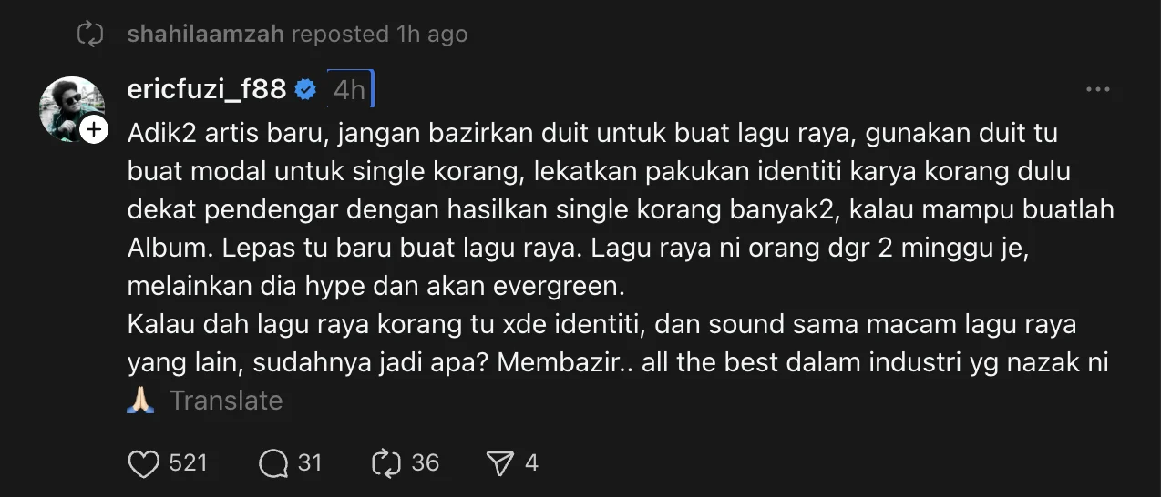 Menariknya, penyanyi Shila Amzah juga dilihat turut repost kenyataan tersebut, sekali gus membuatkan perbincangan ini makin meluas dan jadi topik hangat dalam kalangan penggiat industri.