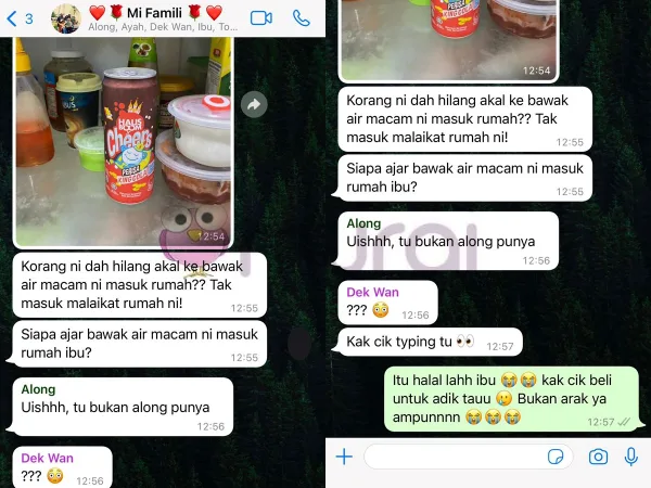 Wanita berkenaan menegur siapa diantara ahli keluarganya yang membawa masuk minuman tersebut menerusi pesanan mesej WhatsApp kumpulan keluarganya. Melihat mesej tersebut, anak wanita berkenaan segera jelaskan minuman tersebut halal untuk diminum.