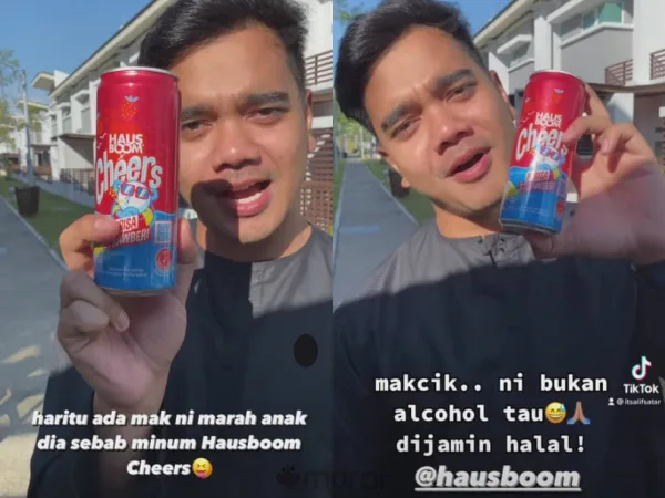 “Jangan risau makcik, kakak-kakak, tuan-tuan, puan-puan ini dia HausBoom X Cheers buatan tempatan. Jangan risau dia ada logo halal kat sini. The Boom beverage HausBoom Cheers jangan risau halal selamat untuk di minum” ujar Alif