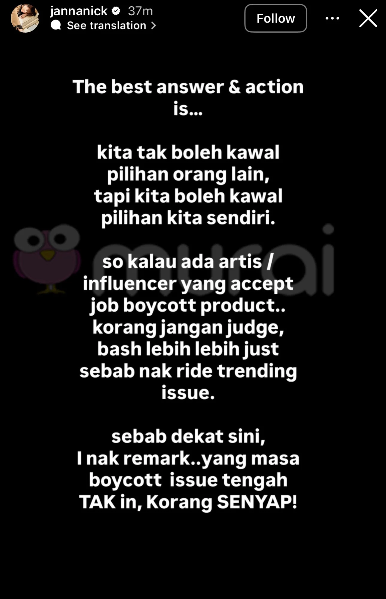 “Keep boycott Janna. Momentum Malaysia masih terbaik buat masa sekarang. Pak Arab pun respect. Yang nampak makin ramai tu memang geng tak boikot yang sebelum ni malu-malu nak makan. Kalau nampak sesiapa promote tu, Janna tolong jugak sebarkan awareness.”