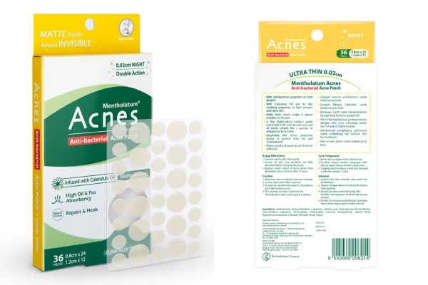 - Mentholatum Acnes Anti-Bacterial Calendula Night Patch 36’s: Acne patch ini mengandungi minyak calendula yang berfungsi untuk menenangkan kulit serta Carbosymethyl Cellulose (CMC) yang menyerap nanah dan jerawat dalam jerawat.