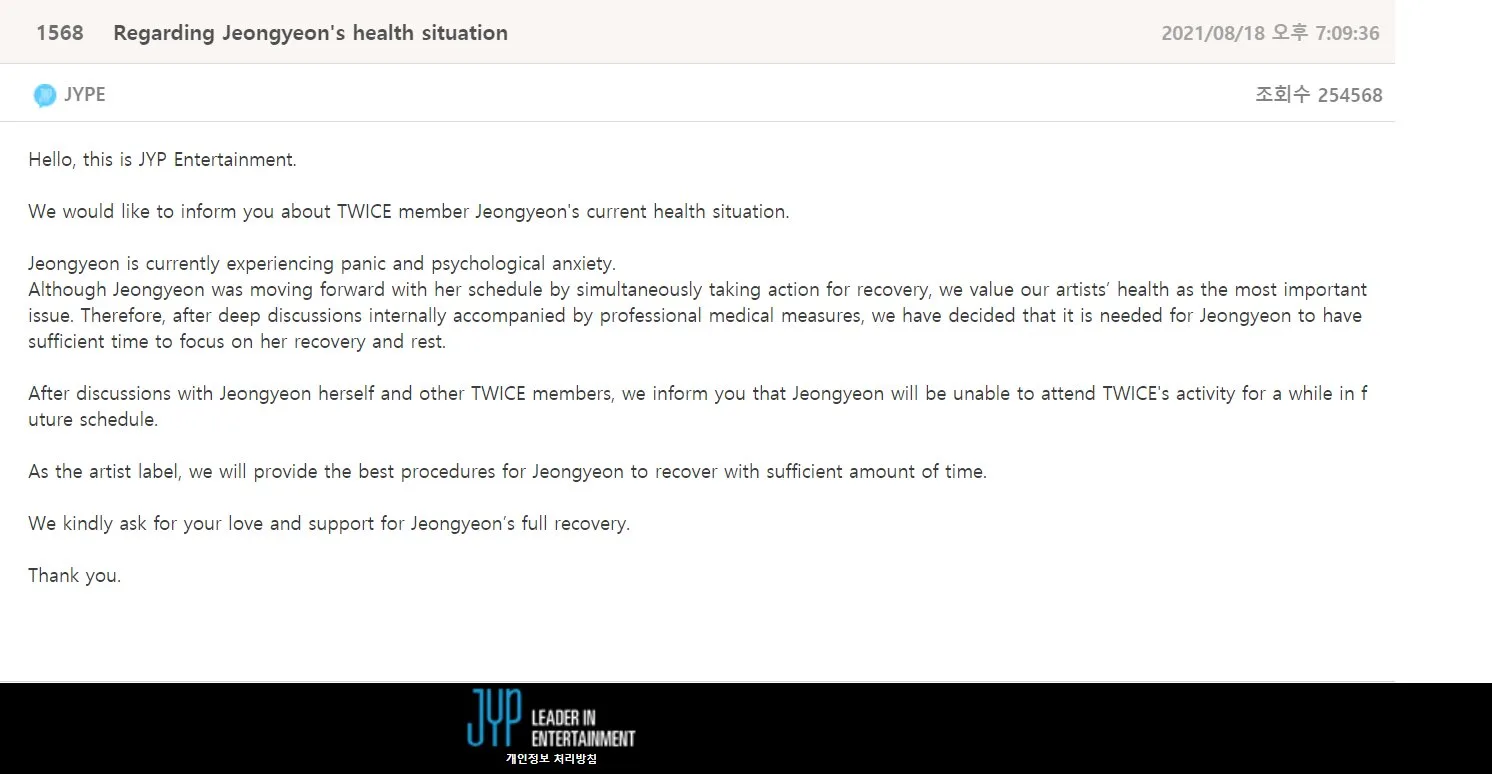 Melalui pengumuman menyedihkan yang dimuatnaik di kafe peminat rasmi TWICE, JYP menjelaskan kepada peminat mengenai keadaan kesihatan bintang itu dan mendedahkan bahawa Jeongyeon diserang panik dan kemurungan secara psikologi.