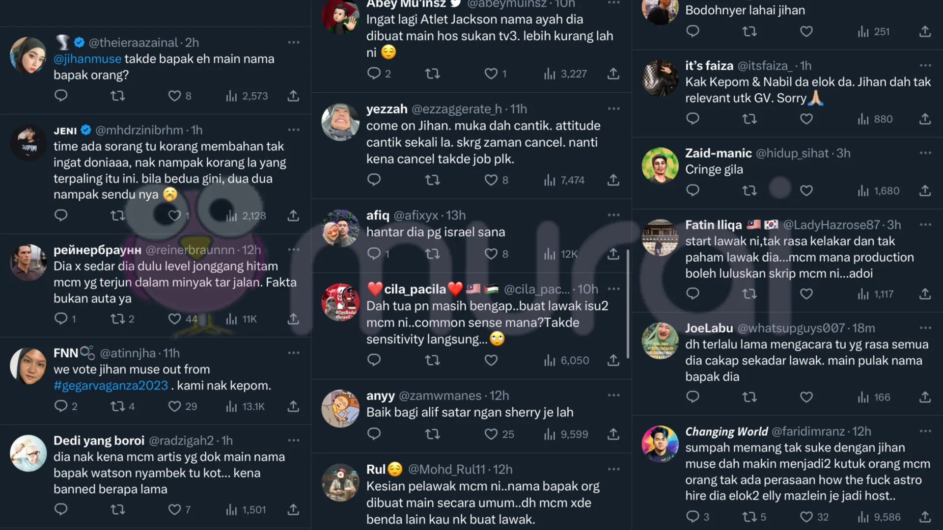 Pengacara, Nuur Jihan Binti Musa atau lebih dikenali sebagai Jihan Muse mendapat kritikan netizen selepas dikatakan membahan vokalis kumpulan Caliph Buskers, Azmi Saat ketika siaran langsung program realiti All Stars Gegar Vaganza, malam tadi.