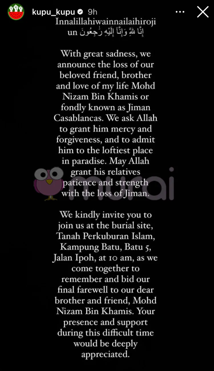 “Dengan rasa duka, kami kehilangan sahabat dan abang, Mohd Nizam Bin Khamis atau lebih dikenali sebagai Jiman Casablancas.