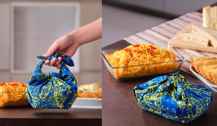 Pembungkus bekas makanan buatan tangan ini diilhamkan daripada warna diraja bendera Sweden serta motif batik tradisional kita, yang melambangkan kekayaan warisan Malaysia.