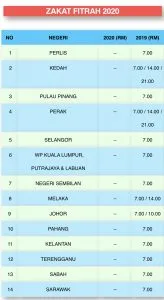 Berikut adalah senarai Jadual Kadar Bayaran Zakat Fitrah 2020 untuk seluruh negeri di Malaysia.