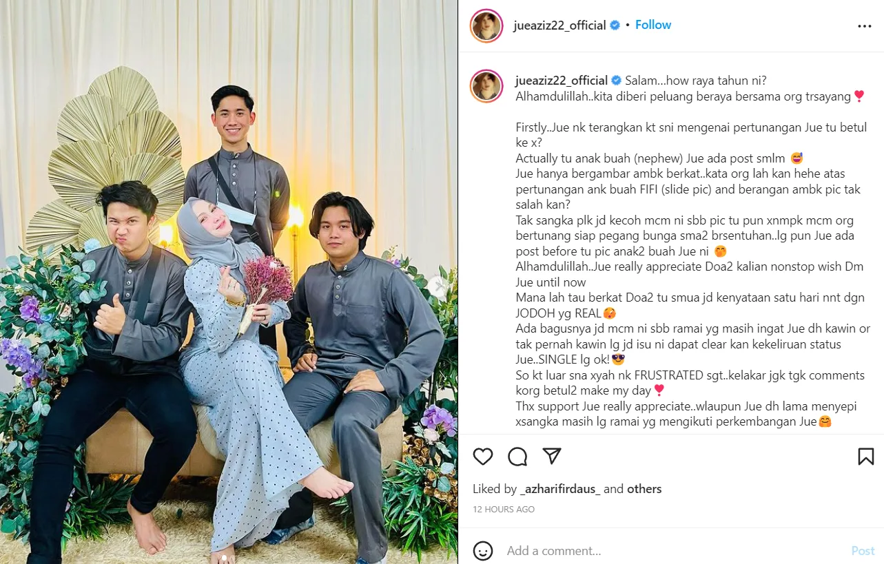 Pelakon, Jue Aziz tampil memberi penjelasan selepas memuat naik foto menunjukkan dirinya berada di atas pelamin bersama seorang jejaka. Ia telah mencetuskan bualan netizen hingga ada yang mendakwa Jue Aziz telah selamat bertunang dengan jejaka tersebut.
