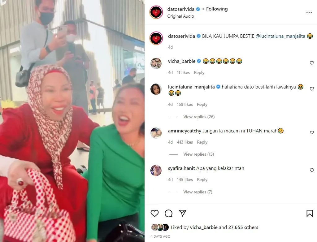 Sementara itu, di ruangan komen Instagram Vida, rata-rata netizen menegur dan mengecam tindakan usahawan itu seolah memalukan diri sendiri dan tindakannya yang bersentuhan dengan Lucinta yang seperti diketahui umum seorang lelaki.