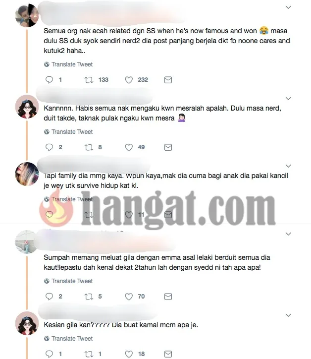 Dalam perkemnbangan lain, di Twitter kebanyakan netizen dikatakan mula menyampah dengan sikap Emma yang kononnya hanya mendekati lelaki yang kaya sahaja. Malah ada juga yang berasa simpati dengan Kamal Adli yang sebelum ini dikatakan hangat bercinta dengan Emma namun pengakhirnya Emma hanya menganggap Kamal hanya sebagai seorang kawan sahaja.