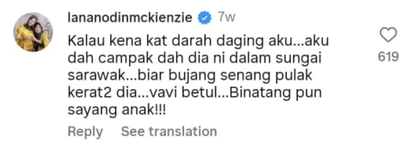 “Kalau kena kat darah daging aku… aku dah campak dah dia ni dalam sungai Sarawak… biar bujang senang pulak kerat-kerat dia… va*i betul… binatang pun sayang anak!!!” tulis Lana.
